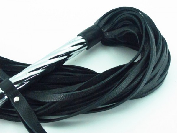 Выпол­нена плеть из нату­раль­ной кожи в чер­ном цвете. Метал­ли­че­ская руко­ять вен­чает кото­рую вели­ко­леп­ный декор, поз­во­лит "нака­зы­вать" ниж­него с осо­бым удо­вольствием! А, спе­ци­аль­ная петля поз­во­лит кон­тро­ли­ро­вать силу и направ­ле­ние удара