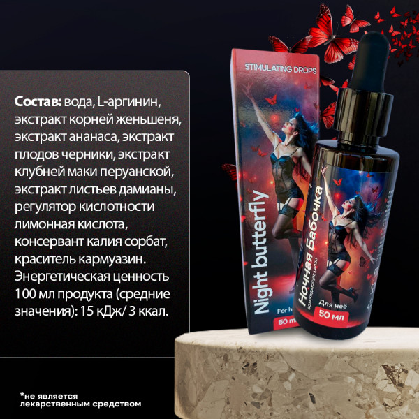 "Ночная бабочка" - возбуждающие капли, которые воздействуют на женский организм, тонизируют и пробуждают чувственность, усиливают чувствительность во время полового акта. Компоненты препарата вызывают у женщин мощное возбуждение и усиливает влечение к мужчине. Помимо этого, средство позволяет получить больше удовольствия от секса!